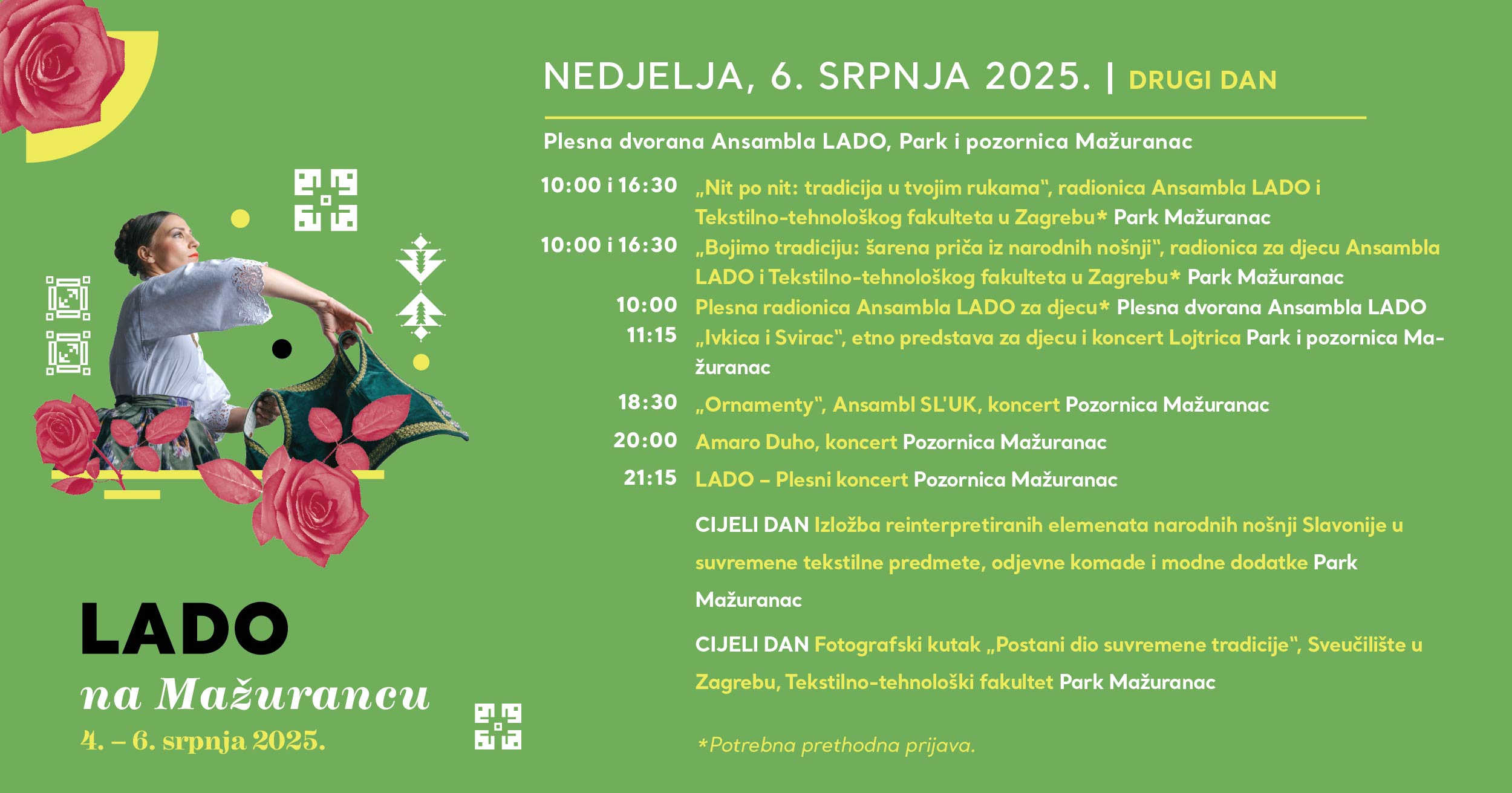 LADO na Mažurancu jedini je festival posvećen hrvatskoj tradiciji i world music glazbi. Organizira ga Ansambl LADO i njime se na razne načine promiče tradicijska umjetnost, a u prvom planu su jedinstveni izvedbeni plesni i glazbeni dosezi jedinog nacionalnog profesionalnog folklornog ansambla. Programska okosnica festivala Ladovi su reprezentativni plesni koncerti, brojni koncerti domaćih i međunarodnih izvođača te različite radionice, izložbe i projekcije. Festival se odvija u parku na Trgu braće Mažuranić, a u potpunosti je nekomercijalan, što znači da su svi sadržaji besplatni i otvoreni za javnost. Festival traje dva dana u kojima će LADO predstaviti sva svoja izvođačka tijela koja mogu djelovati samostalno te punu izvedbenu snagu cijelog Ansambla. „LADO na Mažurancu“ u proteklih je pet godina postao prepoznatljivo ljetno događanje u glavnom gradu na kojem se publika upoznaje s radom ove jedinstvene ustanove u kulturi. I ove godine festival Ansambla LADO održava se pod pokroviteljstvom Ureda predsjednika Republike Hrvatske, Ministarstva kulture i medija Republike Hrvatske i Grada Zagreba. Uz Ansambl LADO, festival su organizacijski podržali Etnografski muzej, Tekstilno tehnološki fakultet i gastro manifestacija Caffe de Matooš.